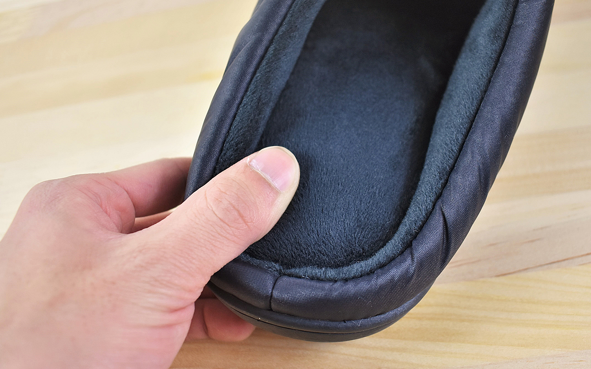 試しに裸足で履いて外へ出かけてみたところ、冷たい風を感じることもなく快適な履き心地。ソールが合成ゴムなので、濡れた地面やタイルの上でも滑ることなく安心して歩けました。