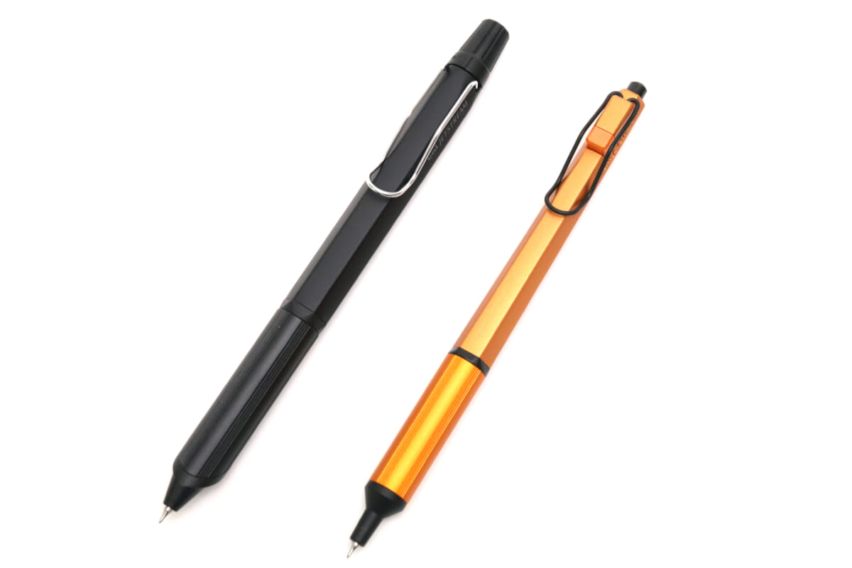見た目は、ワイヤークリップや六角の金属軸、タテ溝の入ったグリップなど、単色エッジの特徴的な要素をピンポイントに継承。ただ、単色エッジが軸後部に向かって細くなる独特な形状をしているのに対して、エッジ3は全体的に真っ直ぐ。