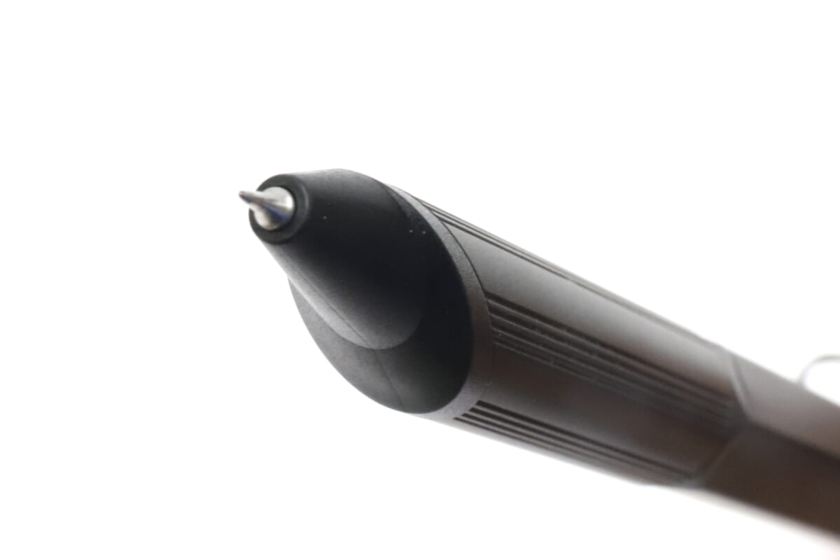 また、ポイントノーズの特殊なフォルムも、使ってみれば違和感はほとんどなし。特に慣れるような手間もかからず快適だ。先端がニードルのように細いポイントチップは、筆記点がよく見えるし、超極細由来のカリカリ感と低粘度油性のなめらかさが上手い具合に噛み合って、とても気持ちよく書くことができる。