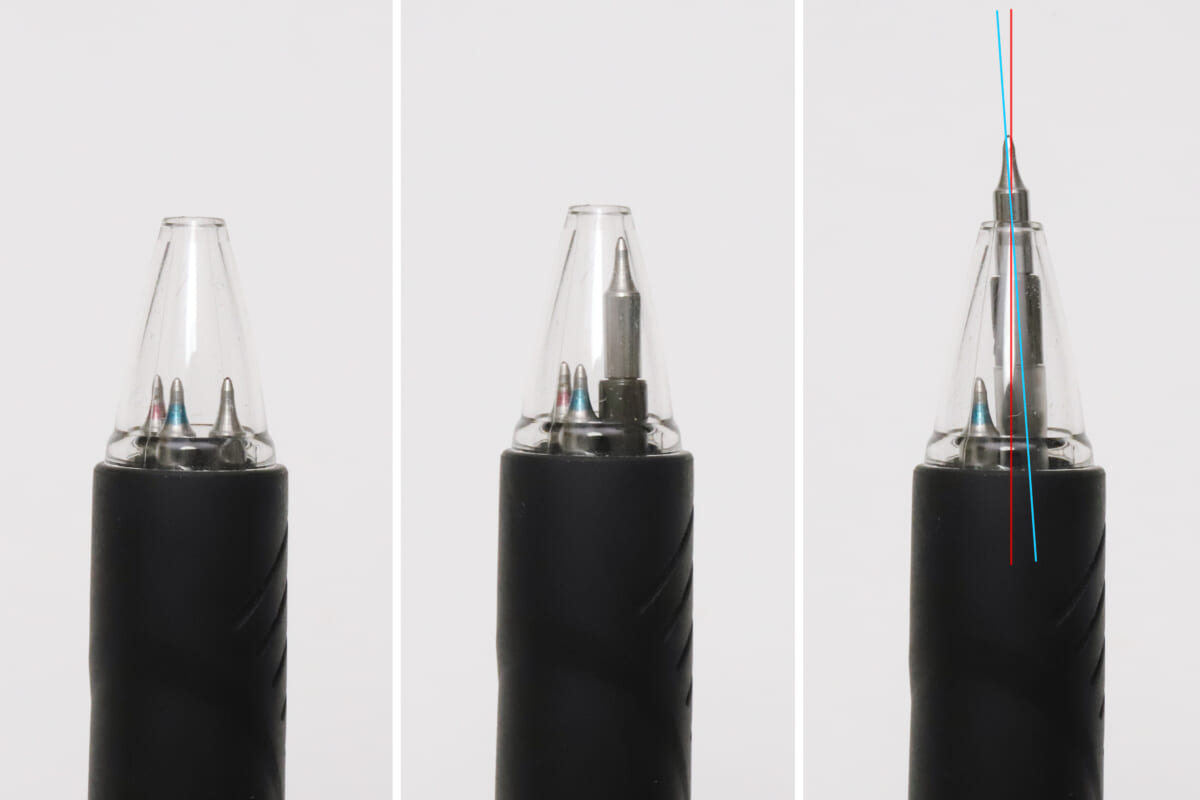 つまり、芯先はコーン内壁に当たることなく真っ直ぐに露出する。これで、多色ペンの“芯先ナナメ問題”は解決だ!