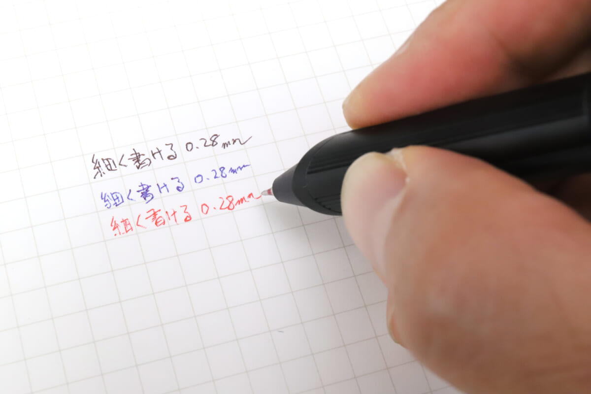 この書き味のバランスはなかなか秀逸で、ここまで極細でも、比較的紙を選ばない。特に手帳用の薄い紙でもひっかかりなく、細かい字がサラッと書けるので、多色と合わせて手帳用筆記具として重宝しそうだ。