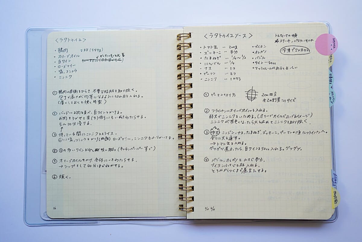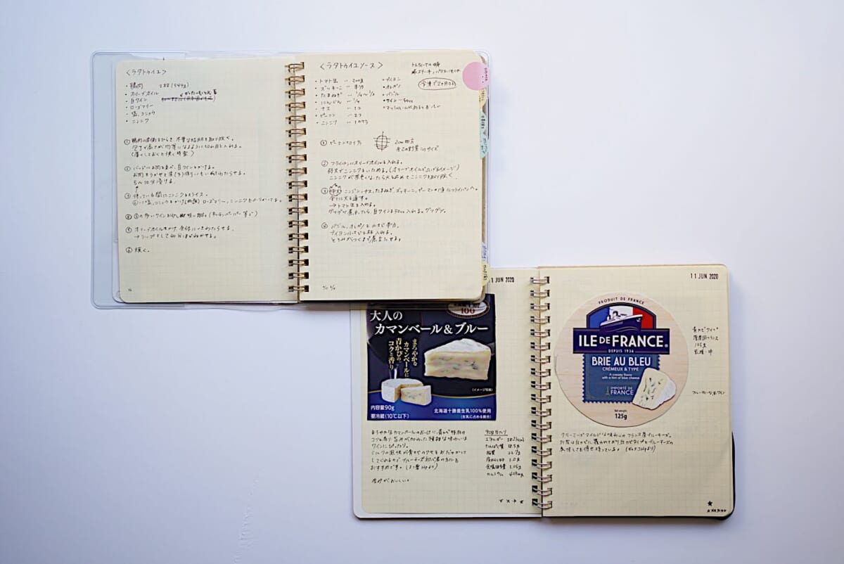 そんなわけで、今の私はロルバーンを2冊、それぞれチーズ記録帖と料理のレシピメモに使っています。どちらの用途でも片方のページだけでまとまるため、折り返せるからです。