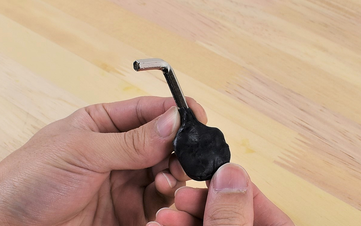 さっそく丸めたものをレンチの端に取りつけ、そのまま数分放置。冷えるとしっかりと固まり、一般的なプラスチック製品と同じくらいの強度になりました。