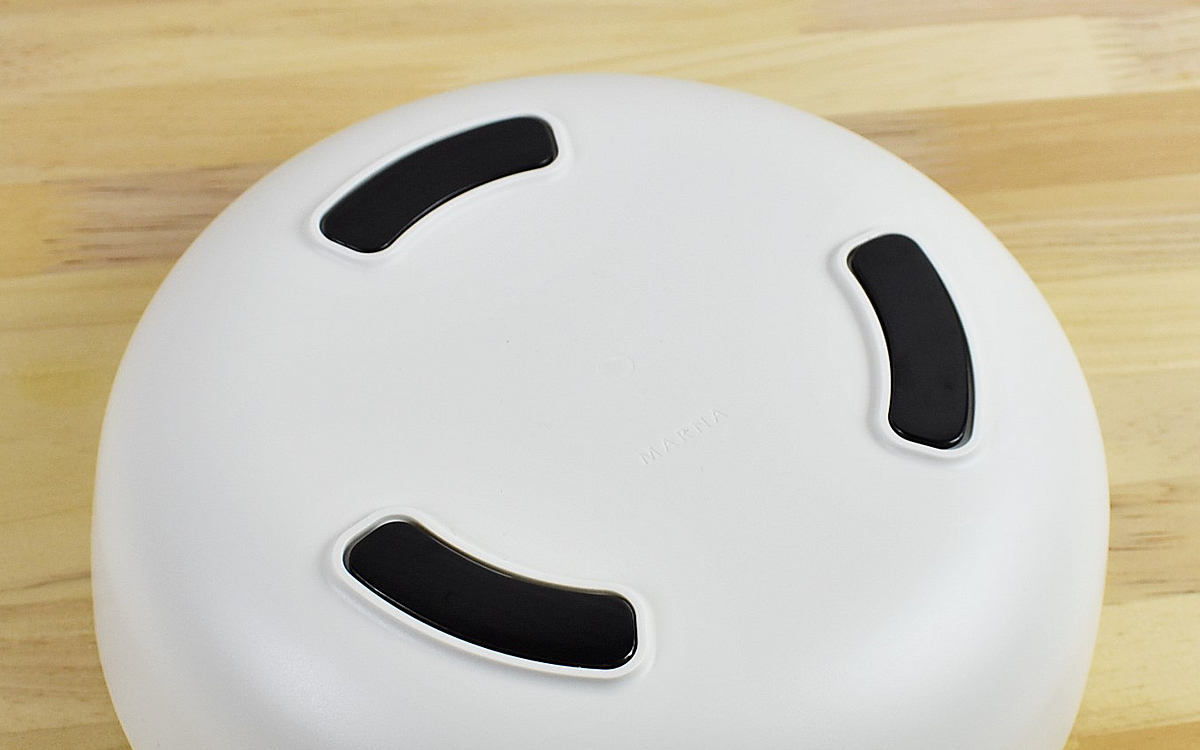 大きさは、約22(幅)×22(奥行)×7.6cm(高さ)ほどの同商品。シンプルなホワイトの湯おけで、裏にはラバーマグネットがついています。凹凸のないフォルムは、汚れがたまりにくいのでお手入れも簡単。全体的に丸みを帯びたデザインが可愛らしい湯おけです。