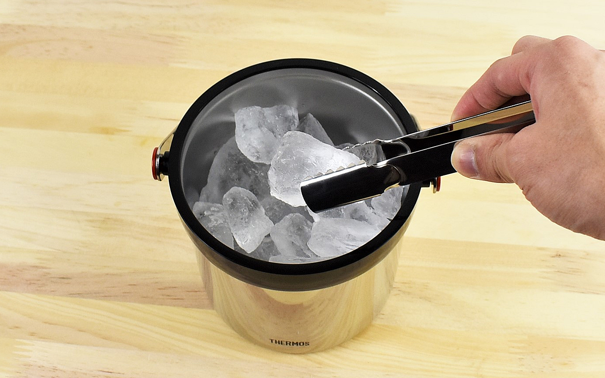 今回はどれくらい氷が解けないのか確かめるため、自宅での晩酌に使ってみることに。まずは本体のフタを外して水切りを底に置き、上から氷を投入。外したフタは本体と取っ手の間に引っ掛けておきましょう。氷を取り出すときは、トングで掴みグラスの中へ。トングの内側がギザギザとした形状になっているため、すべりやすい氷でも簡単につかむことができました。