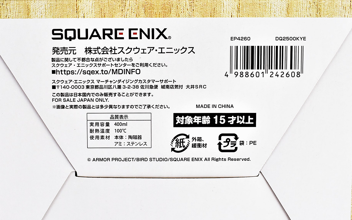 あざやかなイエローに彩られた急須に、スライムの顔が描かれている同商品。大きさは約170(幅)×200(奥行)×120mm(高さ)ほどで、一般的な急須と同じサイズ感です。陶器製なので耐久性もあり、急須としても質のいいアイテム。陶器のツヤ感とスライムのフォルムも相性抜群ですね。