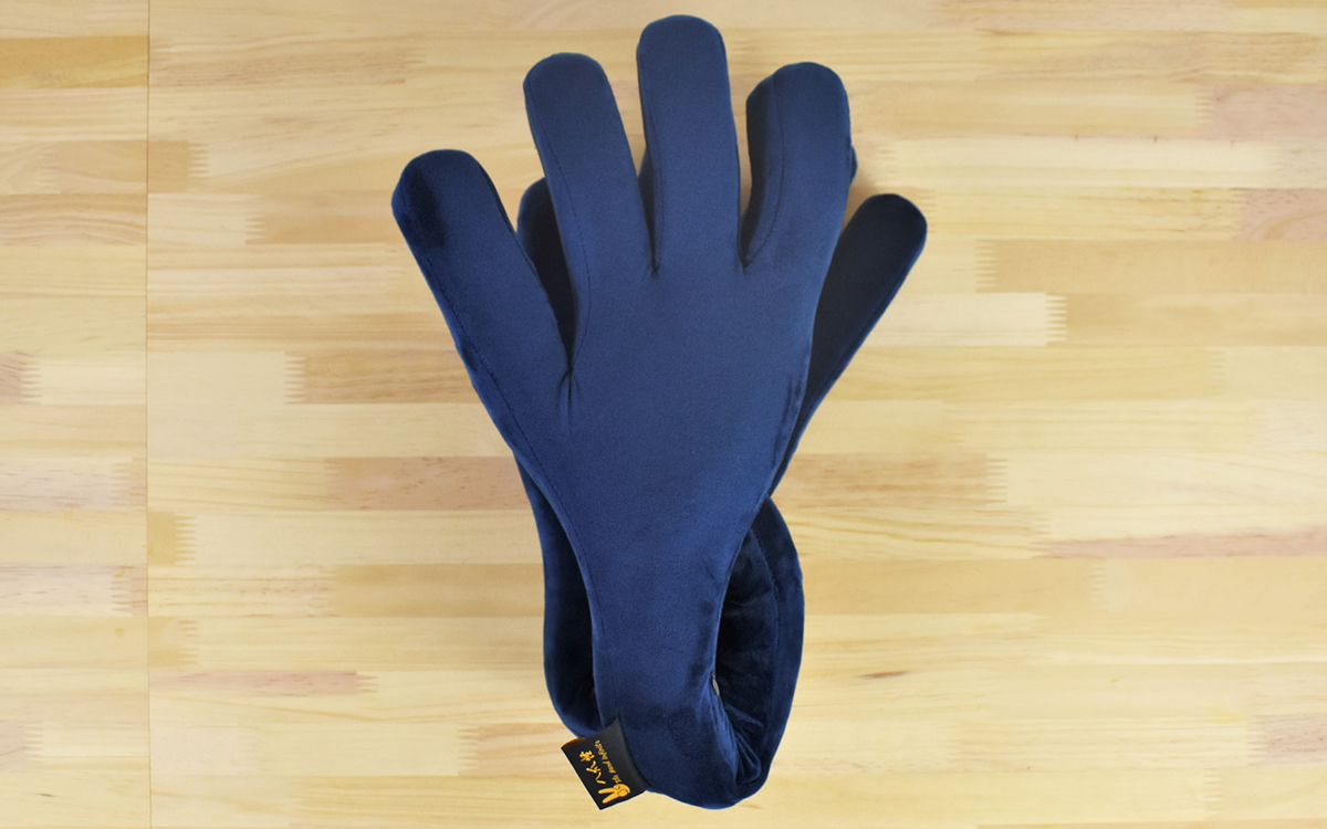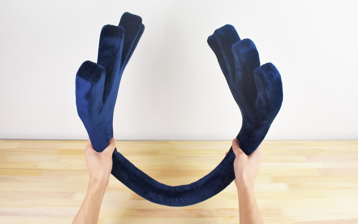 同商品の大きさは、1170(高さ)×380(幅)×50mm(奥行)ほど。4本指の手が左右にあり、手触りの良いスエード生地で覆われています。