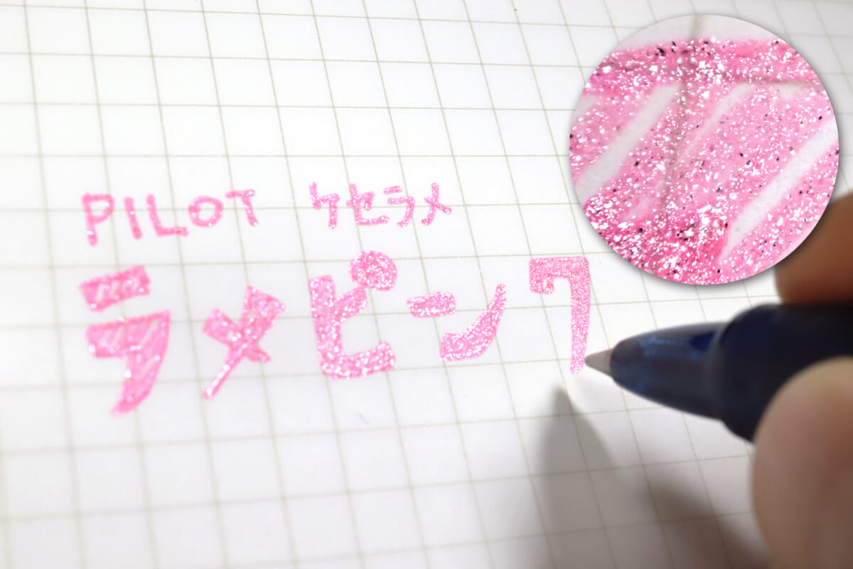 書いてみると、0.7mmの筆跡はたしかにラメだ。もちろん光の当たり方によって変化はあるが、ギラギラ光るというよりは、全体的に細かく光っている印象。ラメの粒子が小さいのだろうか? 正直、昨今のラメボールペンと比べると、ややおとなしいように感じた。