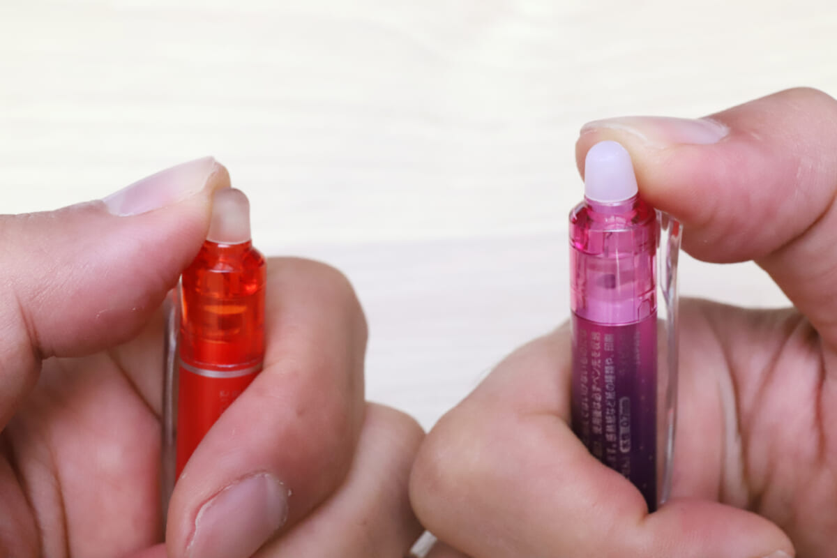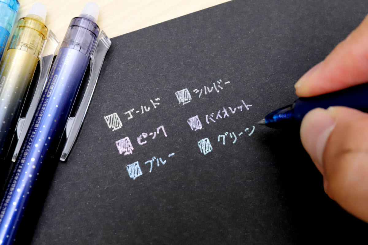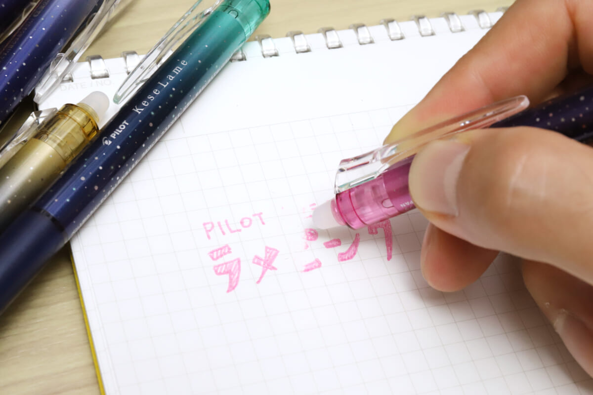 とはいえ、実際にラメの筆跡を見ると「本当にこれが消えるのか?」と疑問に思うが、ペン軸後端のラバーで擦ってみると……おお、消えた! まさに従来のフリクションボールの消す感覚と同じで、きちんと線が見えなくなっている。
