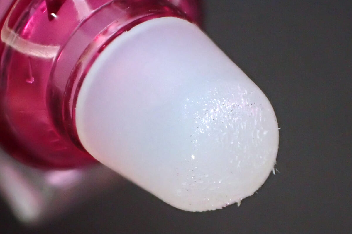 そこであらためてよく観察してみると、消えたはずのラメが、ペン軸後端のラバーにくっついているのを発見した。なるほど、インクは透明化させて消し、ラメ粒子は物理的にラバーでこすり取るという方式なのだ。いわば化学+物理攻撃の二段構えである。