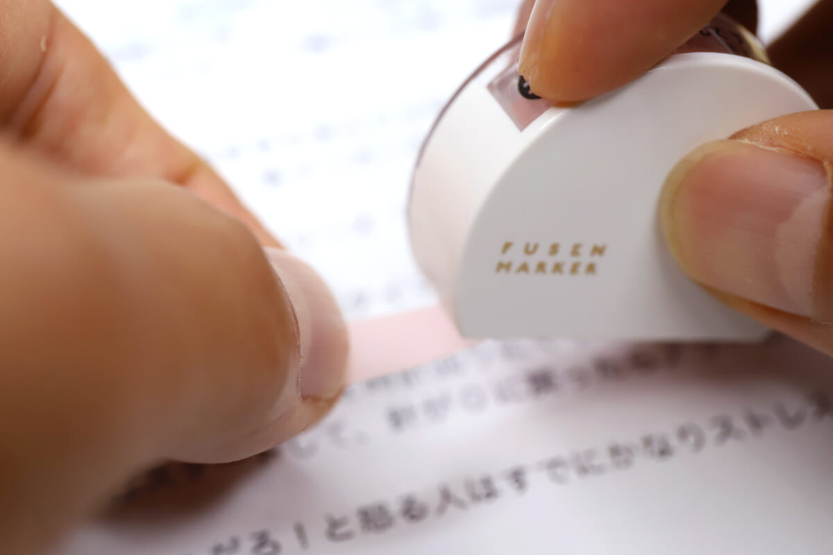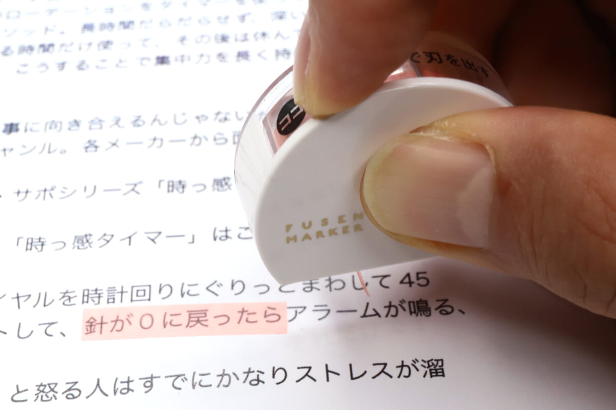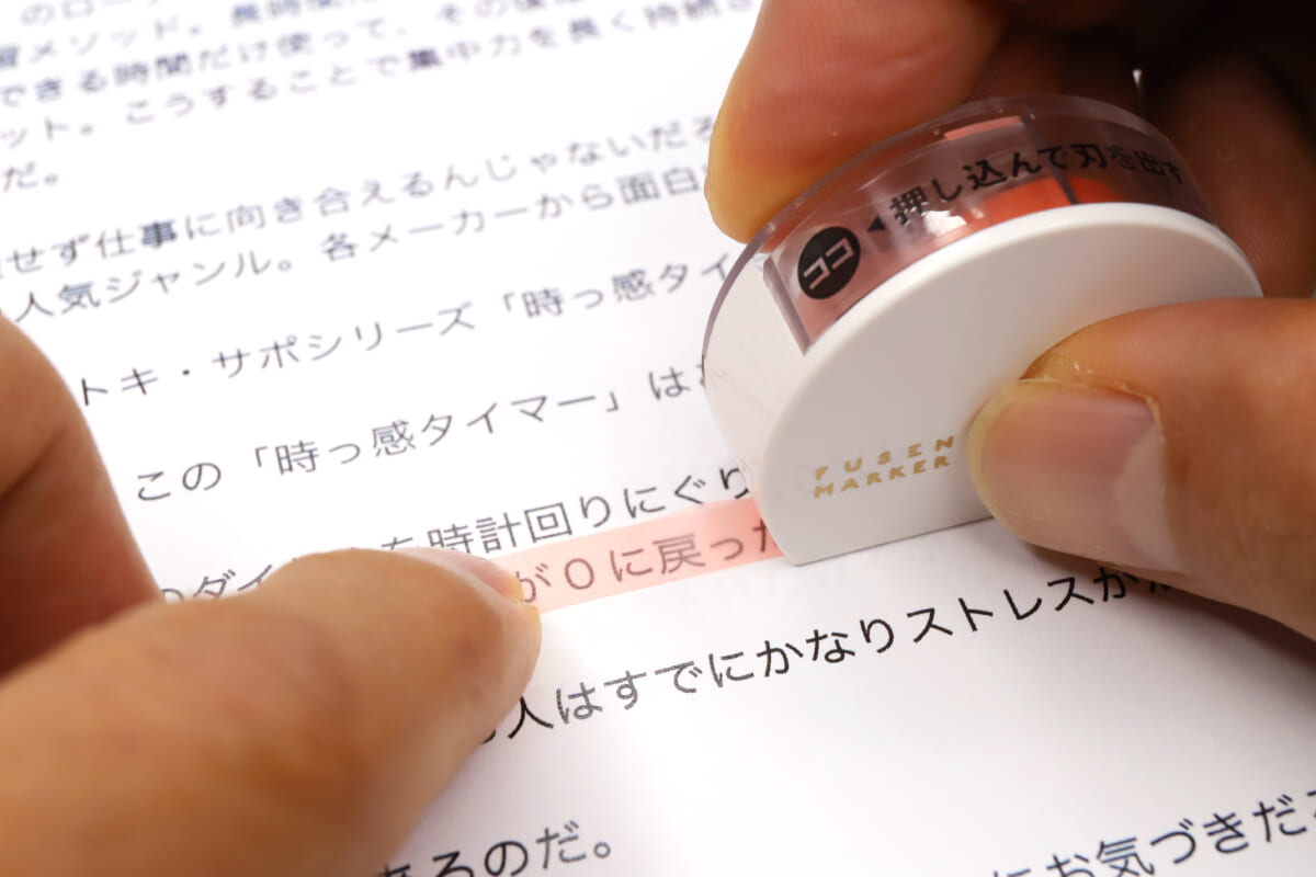 使用する際は、まずケースからピロッとはみ出しているテープの先端を、目立たせたい文字列の先頭に貼り付ける。あとはケースを引いて必要なところまで貼れたら、上部の「ココ」と指示された部分を指で押し込みつつ、ケースを前に倒す。すると内蔵された刃でテープがスパッと切れるという仕組みだ。