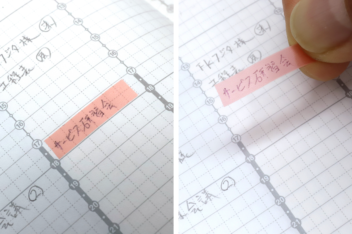 カンミ堂のフィルム付箋の特徴として、筆記具を選ばず貼った上から書ける、というのもポイントだ。手帳の予定欄に貼った上から予定を書き込み、もしリスケされた場合は別の場所に貼り直す、という使い方もできるのだ。