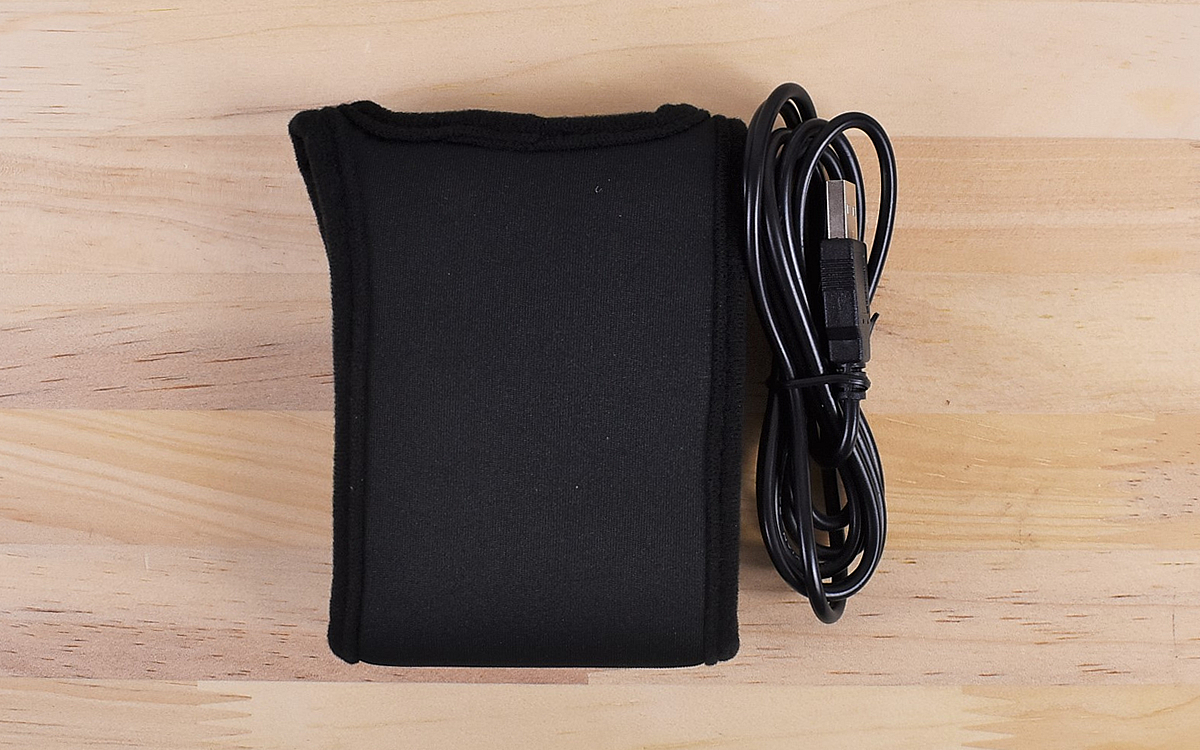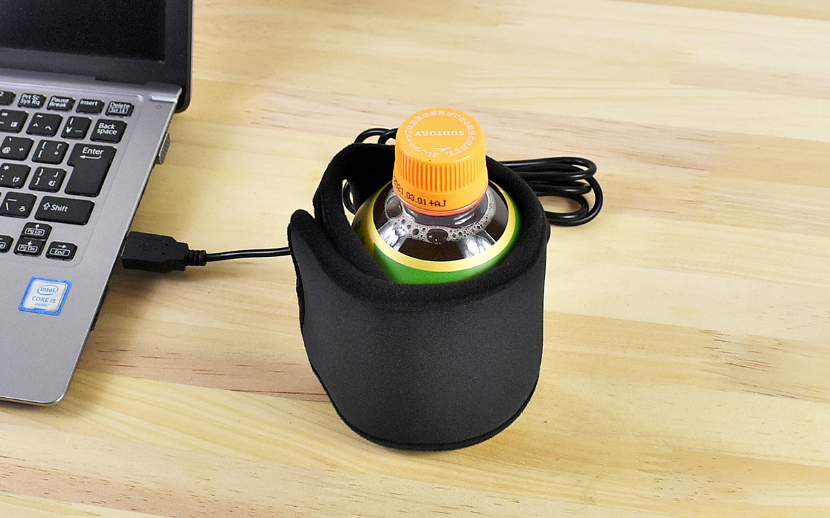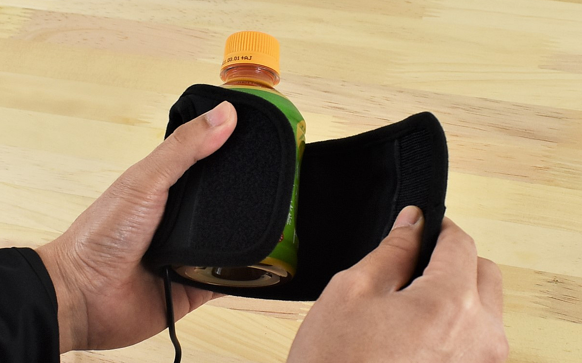 同商品は、約310(横)×80(縦)×10mm(厚み)ほどのドリンク用カバー。端にマジックテープがついており、直径9cmまでのボトルに装着できます。使うときは、まず本体から伸びるUSBケーブルをモバイルバッテリーなどにセット。電源スイッチなどはなく、繋いだ瞬間から徐々に温度が上がっていきます。