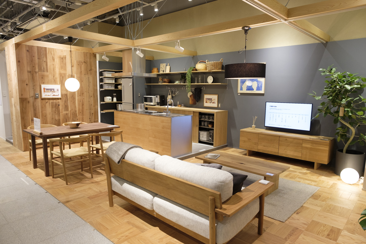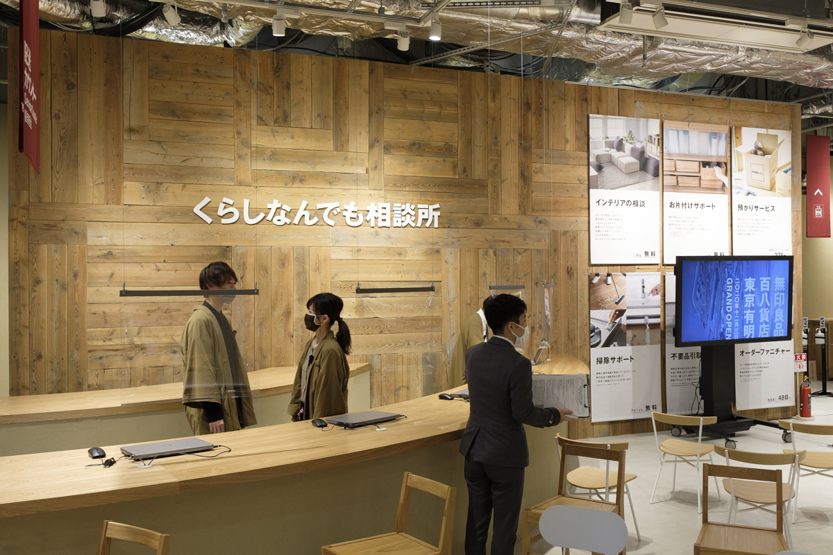 無印良品は、過度な接客や商品解説をすることなく、人それぞれに違う生活習慣や感性を尊重して自由に商品を選んでもらうスタイルが特徴です。40年前、「積極的接客」をするデパートが花形だったことを考えると、無印良品のこのような接客スタイルは相当斬新。このように、あくまでも「人が主役」の無印良品ですが、無印良品 東京有明ではさらに「人のくらしに歩みよる」試みが多く取り入れられています。その一つが【暮らしのサポート】。