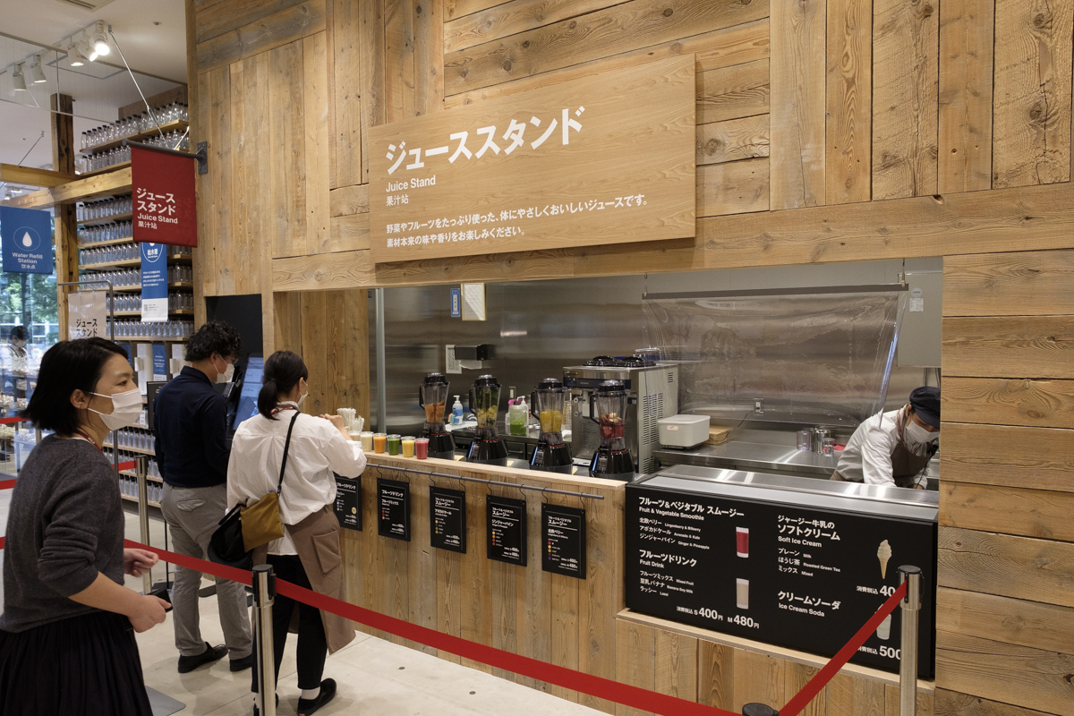 旬の野菜や果物を使ったフレッシュジュースを販売。ショッピングの合間に、季節を感じるジュースをいただけます。この他、その場で食事を摂れるカフェ&ミールや、冷凍食品コーナーなどもあり、一般的なスーパーマーケットとはまるで違う視点から、無印良品ならではの「食」を提案。