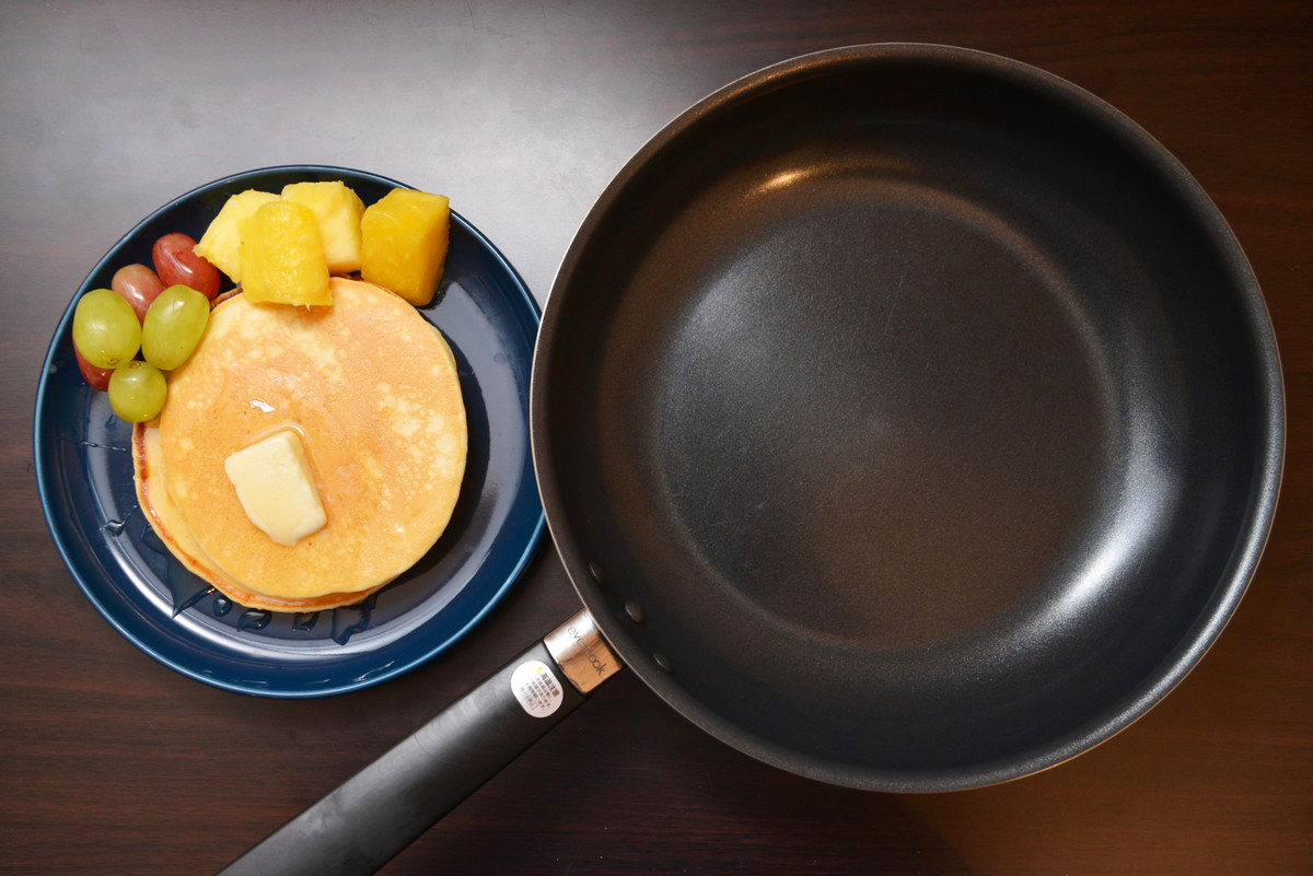 こちらもフッ素コーティングのおかげでよくすべります。焼き上がったあとも、フライパンの上でツルンとスムーズな動き。これならお好み焼きなども上手に焼けそうです。また、今回のホットケーキは弱火でじっくり焼き上げることで、生地がもつポテンシャルを最大限に生かし、もちふわ食感を実現することができました。保温性の高い「evercook Pro」なら、火力を抑えることができるので省エネにもつながりますね。