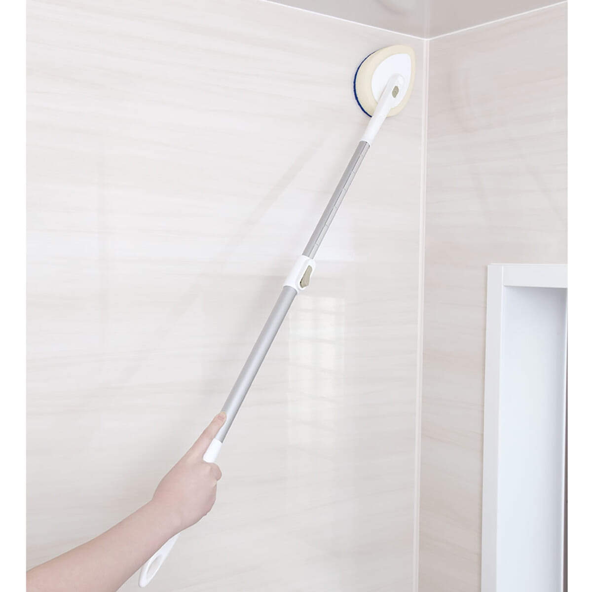 まずヘッドが特徴で、先端をしずく状の造形にしています。このことで曲面、角などの隅々までお風呂の掃除ができるよう工夫しているんですね。また、スポンジ部分は取り換えることもでき、持ち手を短くすればハンディクリーナーとして使うこともできます。