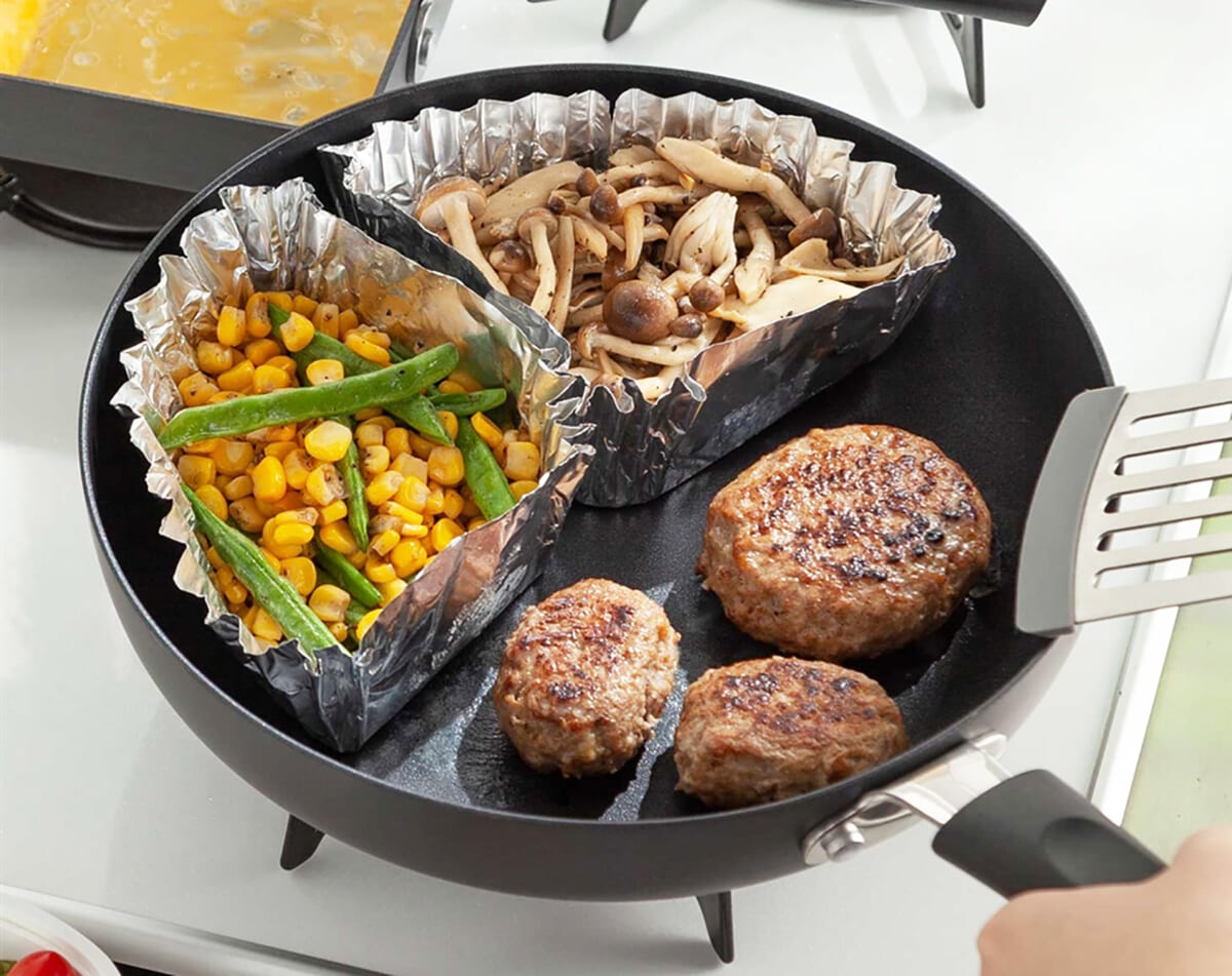 立野 フライパンの仕切りとして使え、例えばフライパンでハンバーグを焼きながら、同時にきのこ、コーンなどの添え物を焼くことができるホイルです。忙しい人には時短になりますし、ガスコンロを複数使わなくて良いので、便利なアイテムですね。ホイルのツヤ消し面にシリコーン樹脂のコーティングが施されており、油を使う必要もなく、加熱後にサラッとはがせるところも利点です。