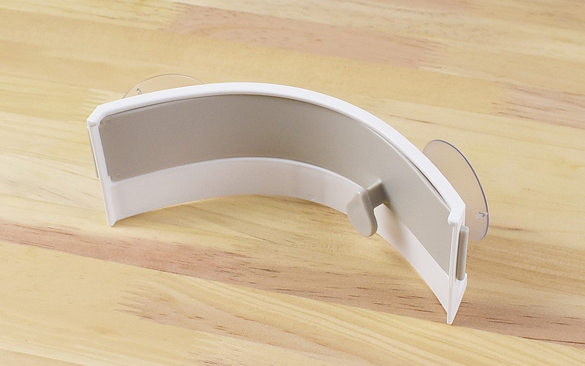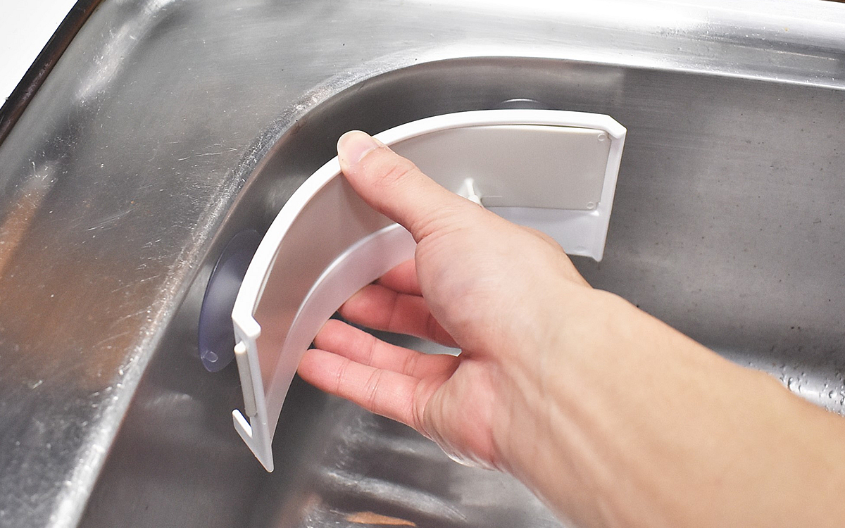 同商品は、約18.2(全長)×6.3(奥行)×7cm(高さ)ほどのアイテム。シンクのコーナーにフィットする曲線型のデザインで、裏側には吸盤がついています。