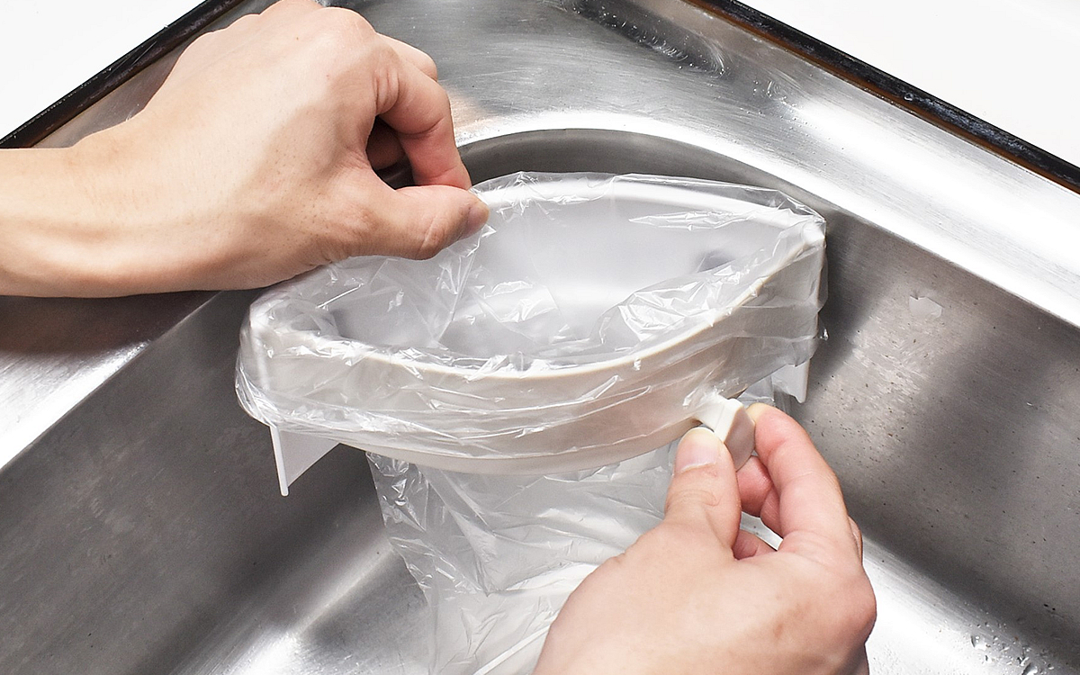 まずは吸盤をシンクに貼りつけ、使いやすい場所に本体を設置。隅についている取っ手を引いてごみ袋をセットすれば、あっという間にごみ受けになりました。