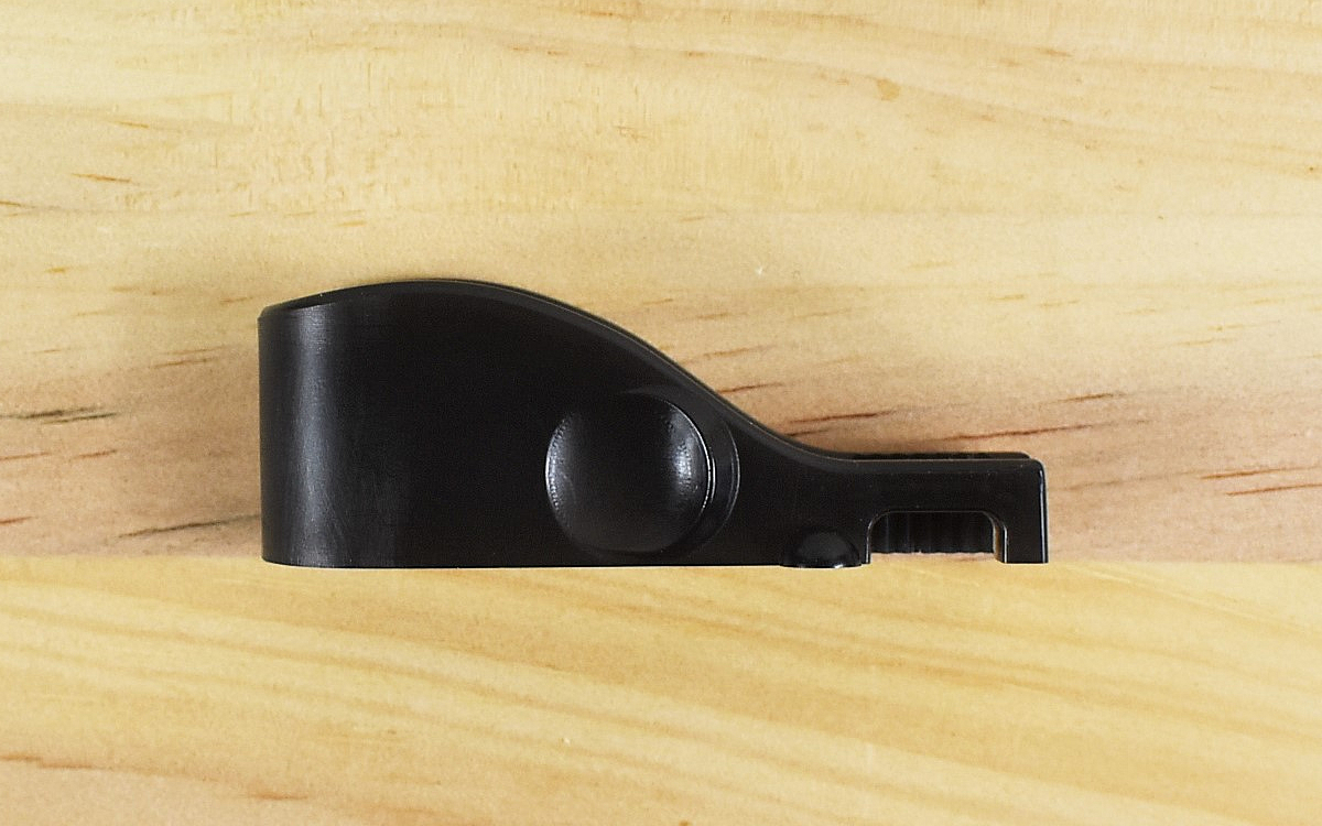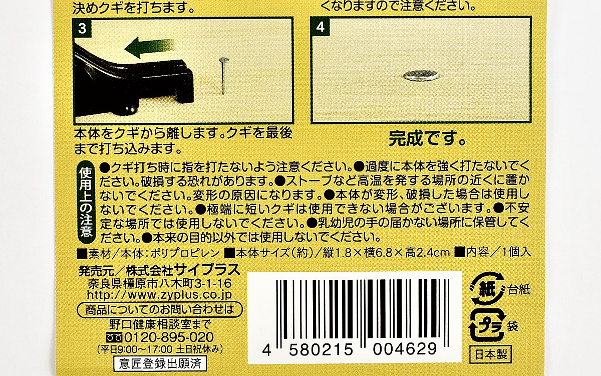樹脂製の同商品は、1.8(縦)×6.8(横)×2.4cm(高さ)のコンパクトサイズ。先端はクギを挟みやすいよう片側だけギザギザになっていて、もう片側はクギを打ち込む位置が確認できるよう“覗き窓”が開いています。
