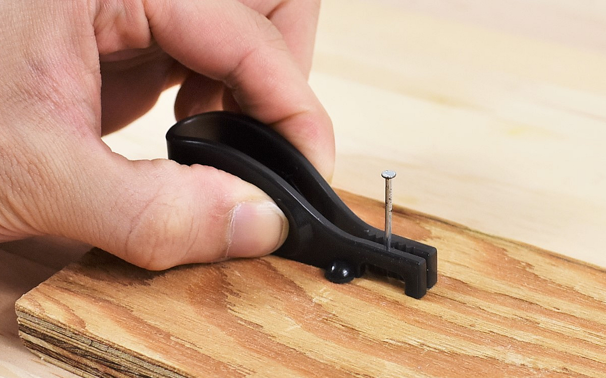 グリップ部分には指置き用のくぼみがあり、持ってみると親指・人差し指にジャストフィット。小さなグッズながらしっかりとつまめるので、短いクギを挟んでも安定した状態で板に押さえつけられました。