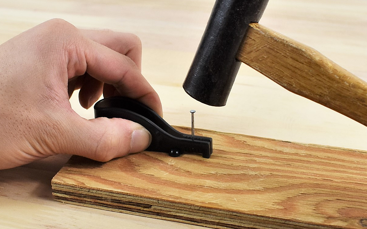 先端部分に刻まれた溝のおかげで、実際にハンマーを振り下ろしてもクギは直立状態を維持。叩くたびに少しずつ刺さっていきますが、指先からクギまで離れているので指を叩いてしまう心配はありません。ちなみにクギを挟んだまま打ち込みすぎると本体を動かせなくなるので、クギ頭を少し残した状態で本体を離しましょう。