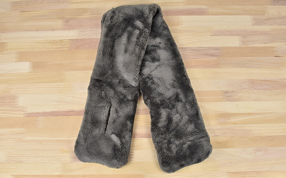 大きさは約92(縦)×14cm(横)ほどで、片方の端に小さめのホールつき。マフラーを首に巻いてホールからもう片方の端を引き出せば、結ぶことなく着用できました。肌触りはとても柔らかく、暖かさ抜群。普通のマフラーと違って長い端を持て余すこともないため、首回りはとてもコンパクトな印象になります。これなら襟元が大きいコートや、フードつきのジャケットにも気兼ねなく合わせられますね。