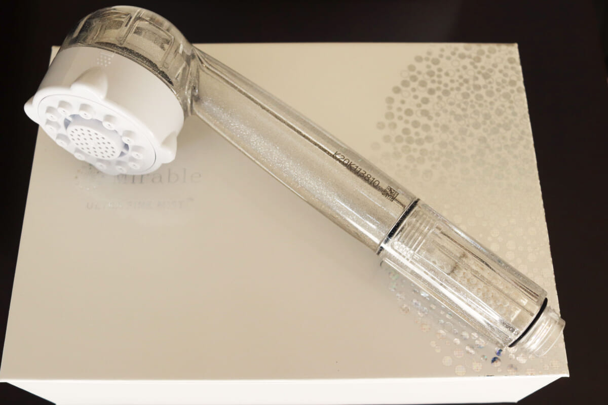 さて、今回の目玉のウルトラファインバブル。ファインバブルといっても区別があり、直径100μm(0.1mm)より小さな泡が“ファインバブル”、さらに1μm以上100μm未満を“マイクロバブル”、1μm未満を“ウルトラファインバブル”と呼びます。ミラブルのウルトラファインバブルは0.1µm(100nm)なのだそう。ここまで細かいとよくわからないのでとにもかくにも、シャワーを浴びます!