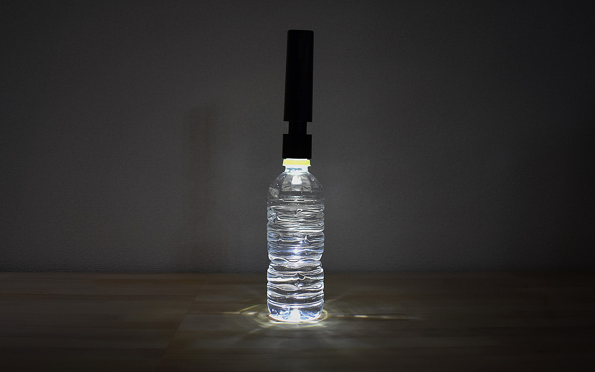 そして特筆しておきたいのが、やはりランタン機能。水を入れたペットボトルに電灯を押し込むだけで、簡易的なランタンに早変わり。暗い場所で試したところ、しっかり明るさを確保できました。これなら簡単に光源を作れるから、暗闇でも安心なはず。