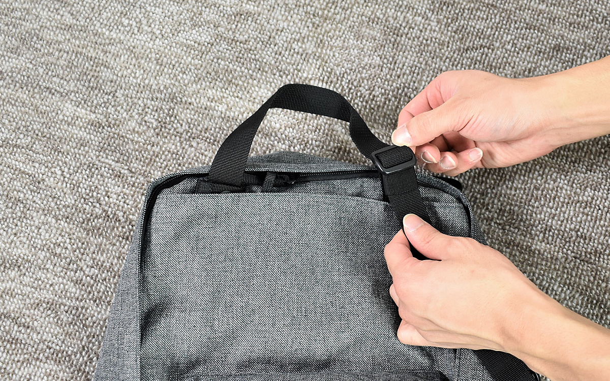 手提げ用のベルトは短いままでも便利なのですが、最大まで伸ばせば肩掛けできる長さに。ベルトの調節も簡単で、リュックの中身をたっぷり詰めた状態でもスムーズに持ち方を変えられました。