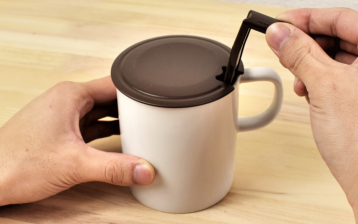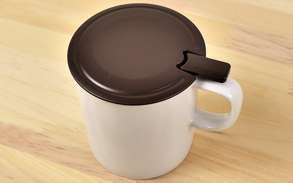 パッケージに入っているのは、上質な陶器のマグカップと専用の泡立て器、マグカップにぴったりフィットするフタの3点セット。マグカップは11.5(幅)×8.5(奥行)×9.5cm(高さ)ほどの大きさで、一般的なマグカップと変わらない質感です。