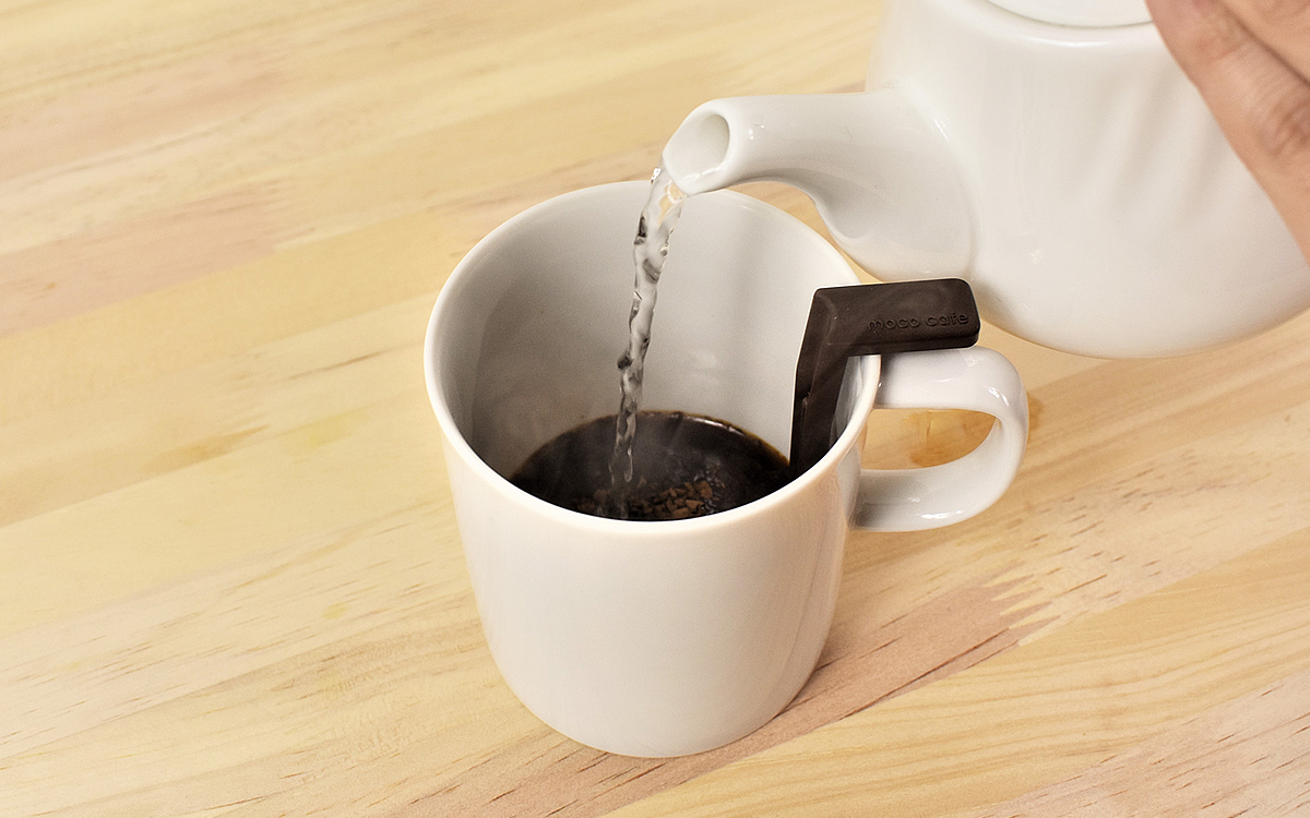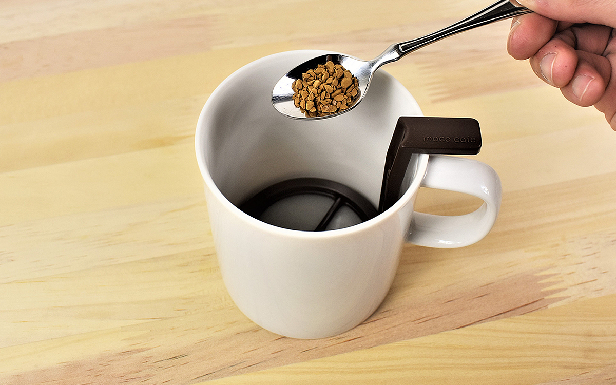 まずはマグカップに泡立て器をセットし、上からインスタントコーヒーをティースプーン3配分投入。お湯は泡立て器の根本についている段差を目印にして、50ml分注いでください。