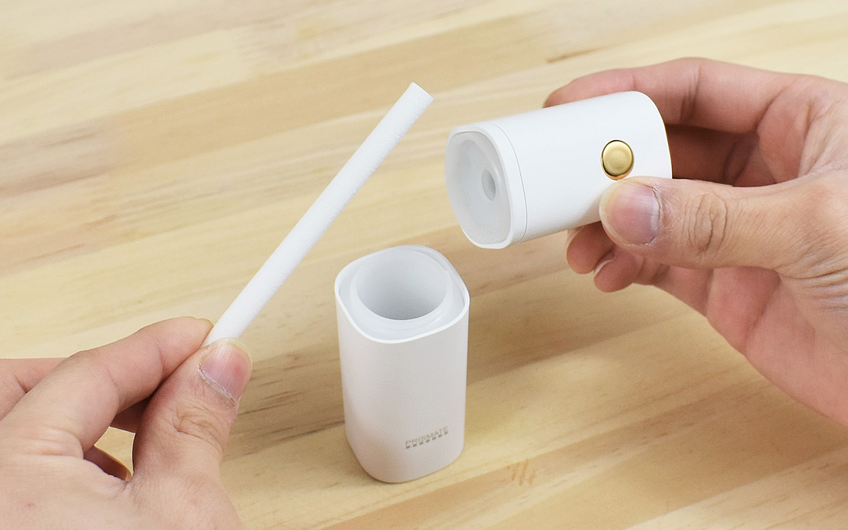 まずは本体を開けて吸引軸を取り出し、タンクに水を追加。水で濡らした吸引軸をセットしたら、加湿したい空間に立てておきましょう。これだけ小さいと、どこに置くべきか迷うことがなくて助かります。