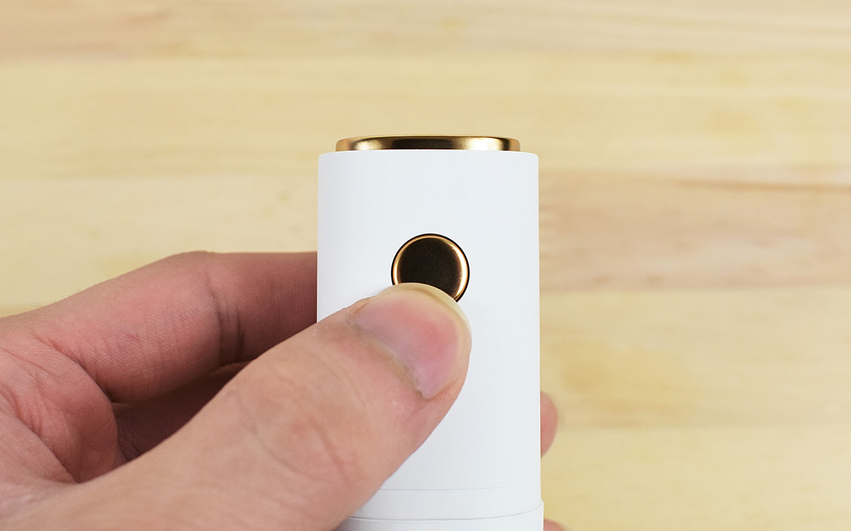 電源を入れるときは、本体の正面についているボタンを素早く2回クリック。1度押しただけでは電源が入らないので、バッグやポケットの中で誤作動が起きる心配はありません。