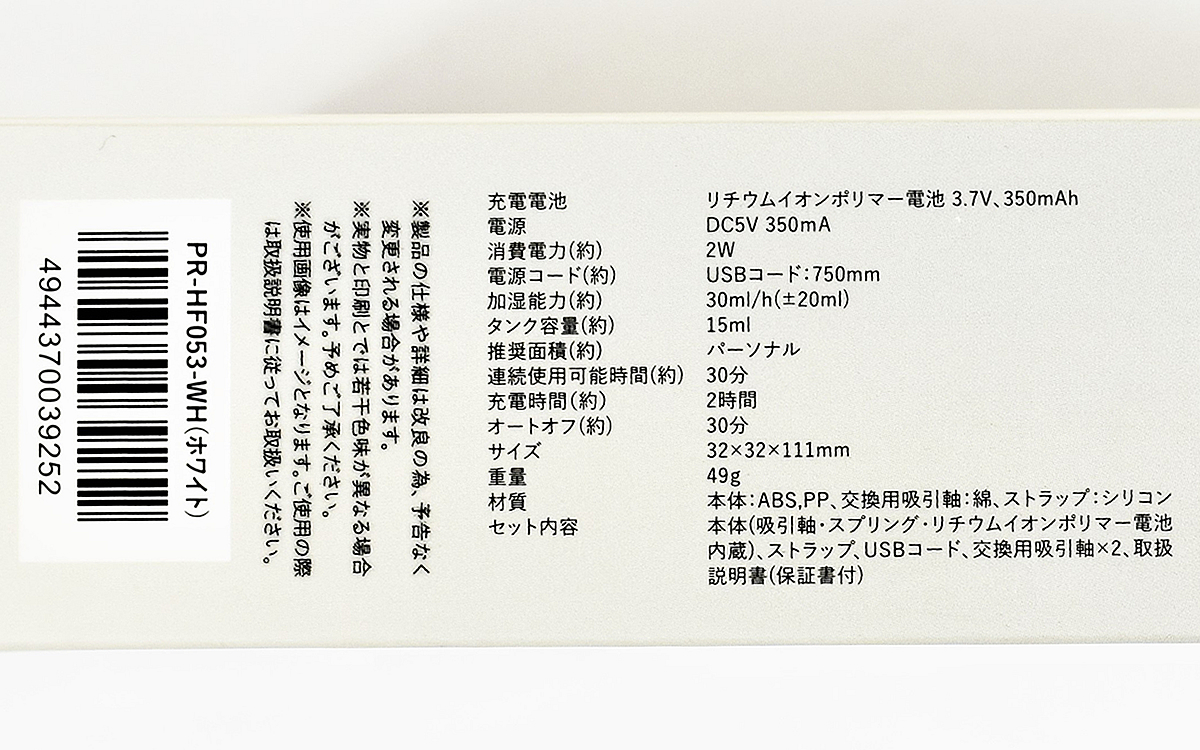 同商品は、約32(幅)×32(奥行)×111mm(高さ)ほどの充電式加湿器。本体とストラップ、充電用USBコード、交換用吸引軸2本がセットになっています。