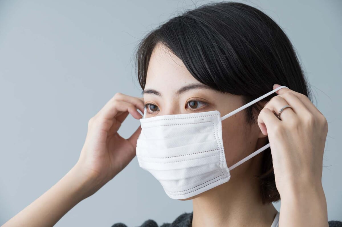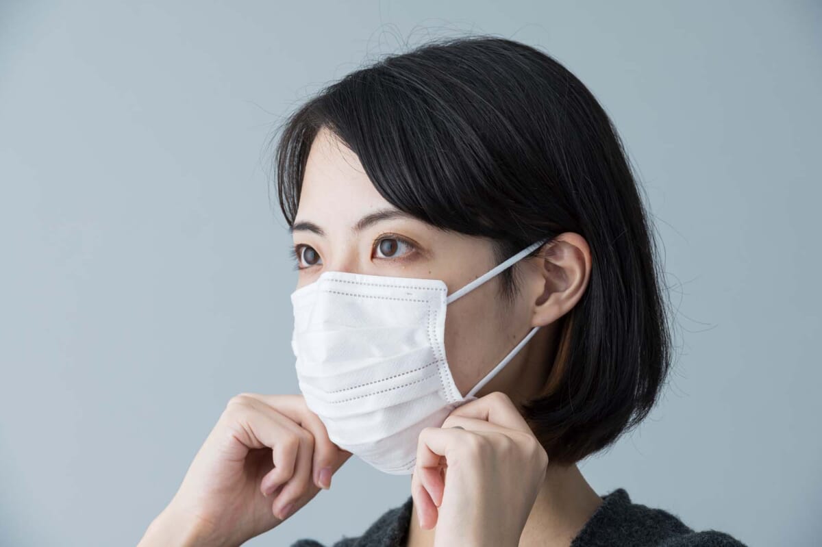 手を清潔な状態にし、マスクの裏表と上下を確認してからヒモを両耳にかける。菌や花粉が折り目に溜まらないよう、一般的には外側のプリーツが「下向き」になるように着けるのが正解だ。