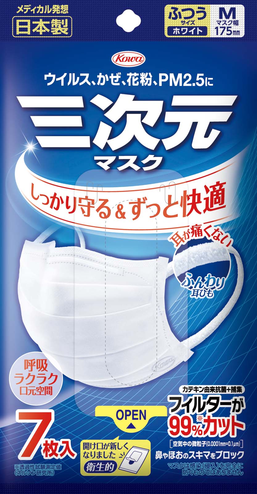 空気中の微粒子を99%カットし、表面に付着した菌の増殖を抑える天然カテキン由来の抗菌フィルターを内蔵。内側に付いたフォグブロックフィルムは呼気の上昇を抑え、メガネのくもりをブロック。耳ひもは従来品よりも改良され、着け心地がアップした。口元の空間をキープし、機能性と高快適性を両立。