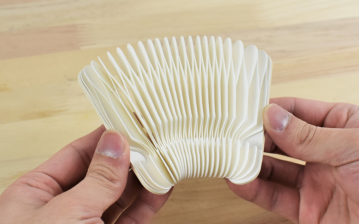 折りたたんだ時の大きさは、95(幅)×20(高さ)×20mm(奥行き)ほどの同商品。“ハトロン”という特殊な紙の材質で、もともとは弾薬を包む目的のもと作られました。そのため耐久性に優れており、対象物をしっかり支えられるのだとか。