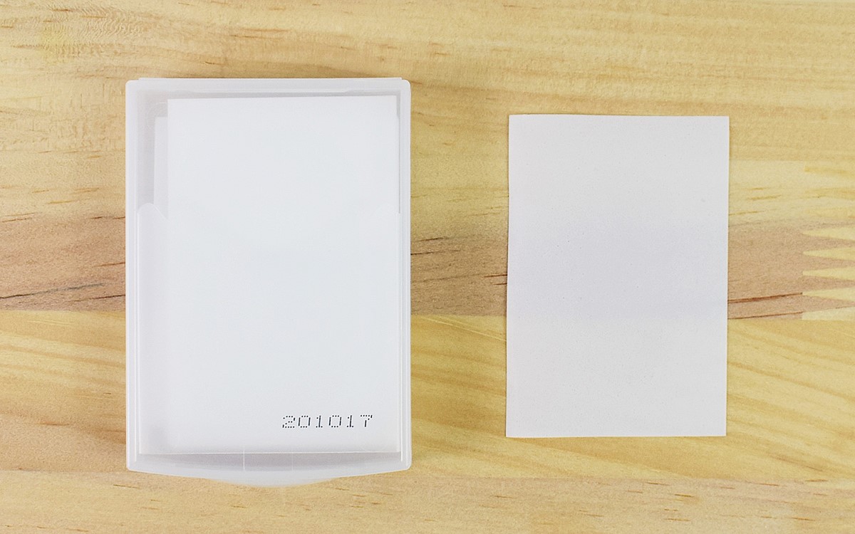 同商品は、5.4(幅)×7.5cm(奥行)ほどのケースに入った使い切り石けん。半紙のような薄さのフィルム石けんが全部で24枚セットになっています。名刺よりも小さいサイズなので、胸ポケットに入れて持ち運んでも邪魔になりません。