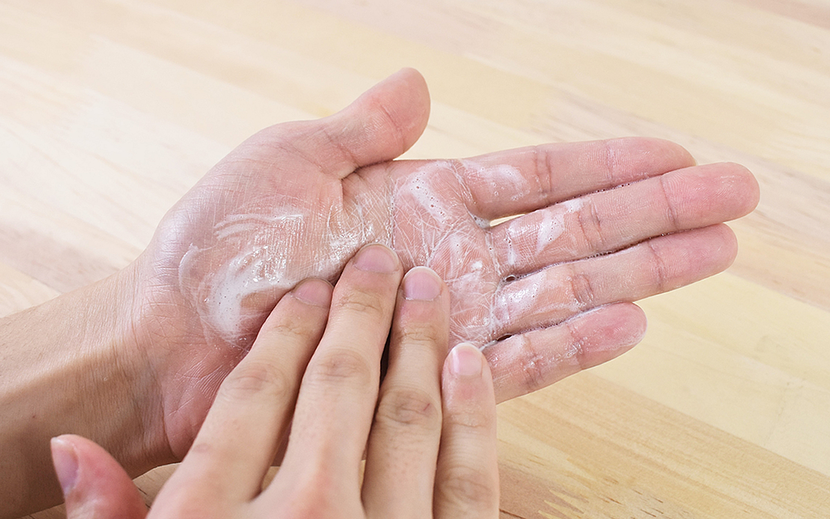 まずは乾いた手で石けんを1枚取り出し、手のひらの上へ。そのまま手と石けんを軽く水で濡らし、よくこすって泡立てましょう。石けんは水で濡らすと溶けてしまうので、洗う前に洗面台へ落とさないように要注意。泡が立ってきたら、手の甲や指の間、手首などをしっかり洗います。