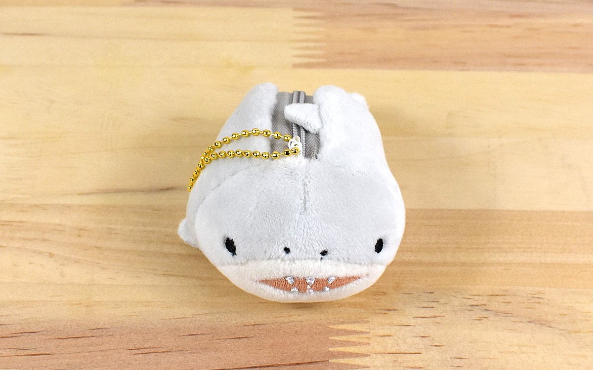 同商品は、7(幅)×4.8(奥行)×4.5cm(高さ)ほどのぬいぐるみ型ポーチとエコバッグのセット。ポーチは可愛いサメの形をしていて、ふわふわの手触りです。