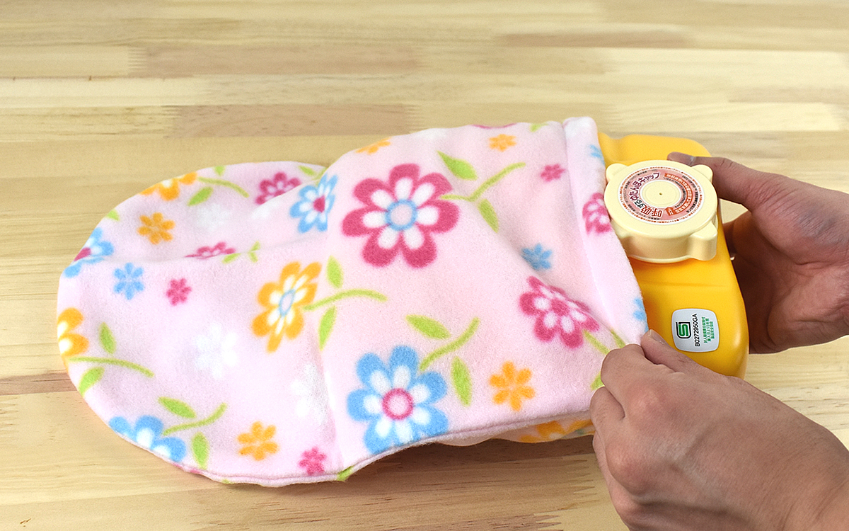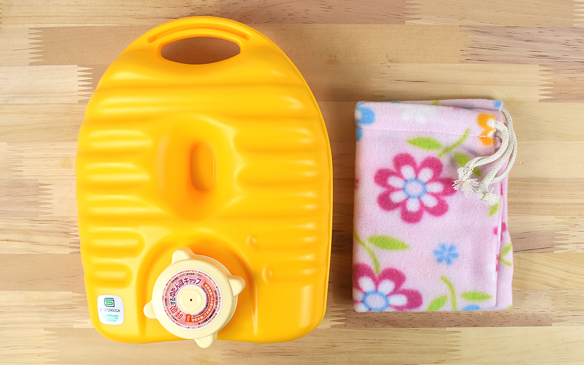 大きさはおよそ250(高さ)×220(幅)×90mm(奥行き)ほど。湯たんぽを入れる花柄の袋もセットでついてきます。