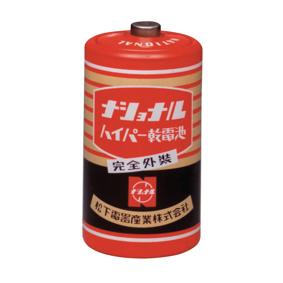第二次世界大戦を経て、戦後の復興とともに乾電池も姿を変えます。1954年、日本で初めての完全金属外装乾電池「ナショナル ハイパー」を発売。いわゆる私たちの想像する乾電池のフォルムとなっています。