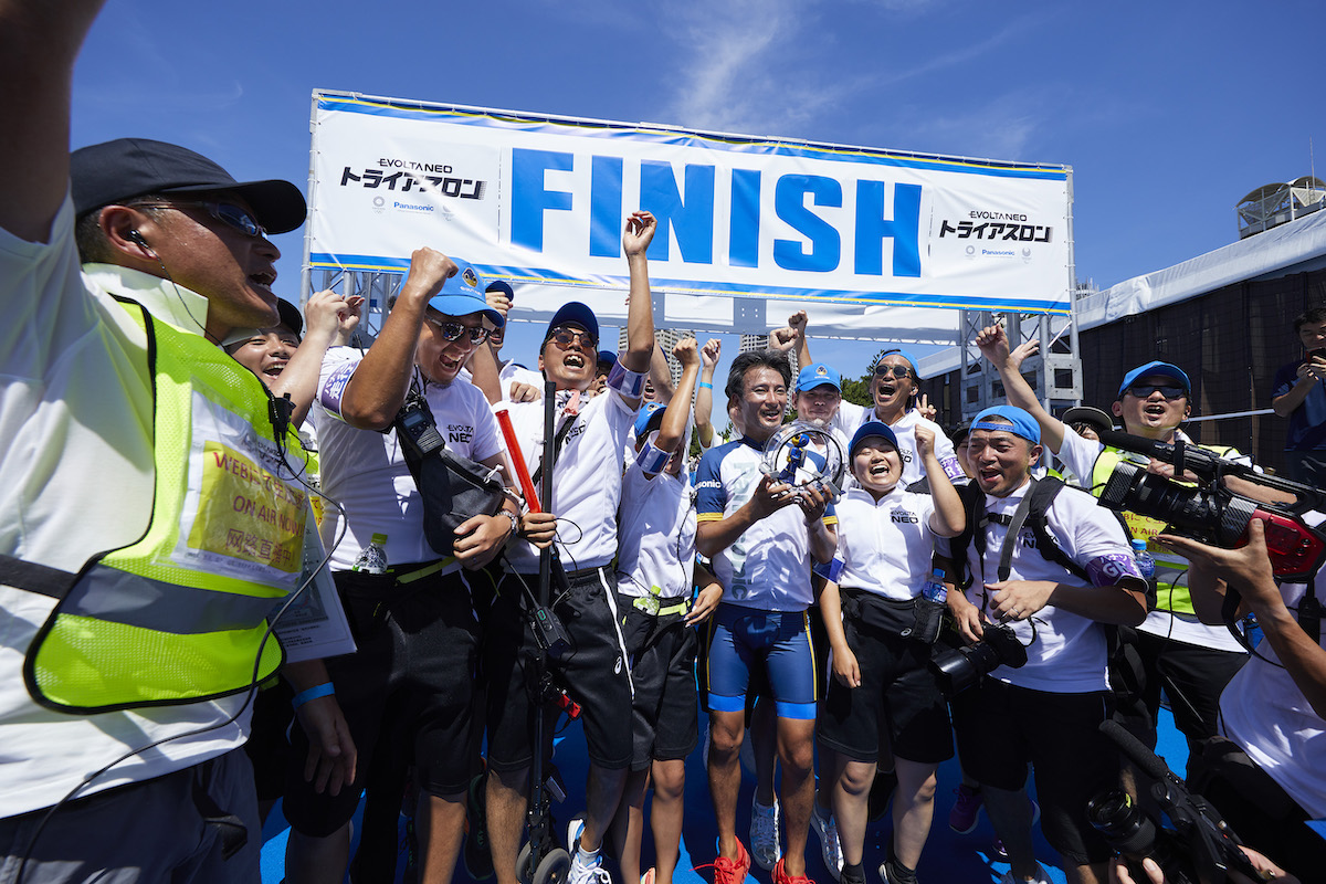 そして2019年は「エボルタNEO トライアスロン」。お台場を舞台にエボルタNEOくんがトライアスロンに挑戦し、目標タイムである1時間45分01秒以内をクリアし、1時間26分40秒でフィニッシュしました。