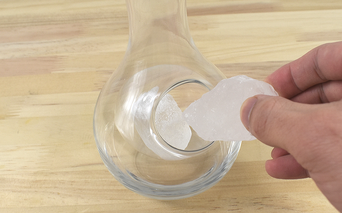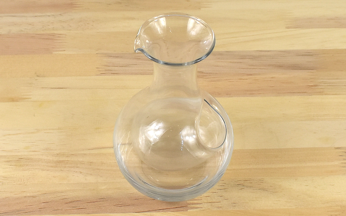 「ソーダガラス」と呼ばれる素材で作られた、クリアな見た目の同商品。大きさは約9.8(幅)×9.8(奥行)×16.5cm(高さ)で、重さが約240gほどあります。少し重く感じますが、空っぽの状態でも倒れにくいのが安心ですね。注ぎ口が細くて底が丸い形をしていて、丸い部分の真ん中あたりには大きくくぼんだポケットが。まずは大きめに砕かれたロックアイスをこのポケットに入れて、上からカフェオレを注いでみました。