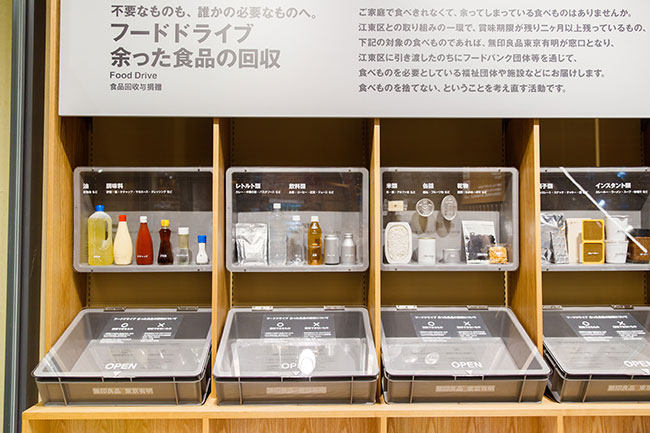 東京有明店で行われているフードロス対策は、量り売りだけではありません。江東区と協力して行う「フードドライブ」活動もそのひとつ。賞味期限2ヶ月以上の未開封の食品を店内設置の回収BOXに入れると、江東区やフードバンク団体を通じて福祉団体・施設に届けてもらえます。
