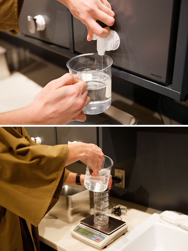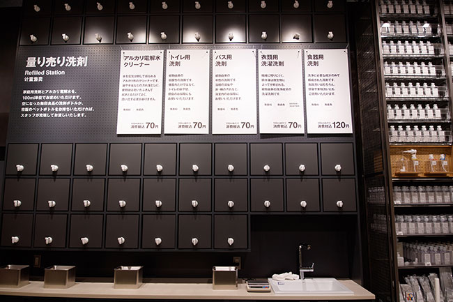 3階では、衣料品を中心に、化粧品や文房具など生活雑貨が広く取り扱われています。なかでも興味深いのが、東京有明店の限定サービス「洗剤の量り売り」。「衣類用洗剤」や「食器用洗剤」などの肌と環境に優しい洗剤4種と、キッチン等の掃除に活躍する「アルカリ電解水クリーナー」を、100ml単位で好きな分だけ量って購入できるんです。使用する容器は、無印良品の使い切った洗剤ボトルのほかに、空のペットボトルでもOK。エコに貢献できるのはもちろん、詰替用の商品を買うより1割程度お得になる場合もあるのがうれしいポイントです。