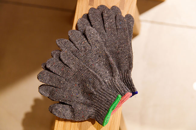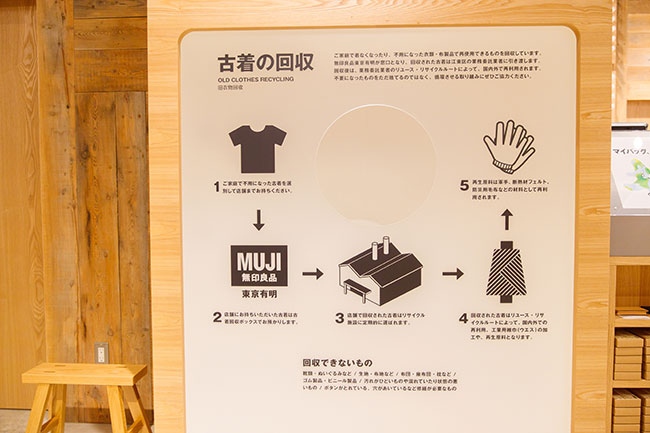 同フロアの「刺繍工房」コーナーの一角には、東京有明店が江東区と協力して行う古着回収のステーションが置かれています。古着の回収とリサイクルは他店舗でも行われていましたが、持ち込めるのは無印良品の商品に限られていました。ところが東京有明店では、無印良品以外の繊維製品も持ち込みOK。スタッフに声をかけてから回収ボックスに古着を入れると、再生原料を使った軍手がもらえます。
