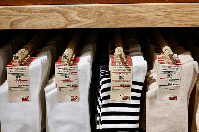 3階で行われている環境への取り組みはほかにも。これまで、靴下やストールの陳列用フックやインナー用パッケージはプラスチック製のものが基本でした。東京有明店では他店に先駆けてこれを見直し、プラスチック原料を中心としたパッケージをなくす、もしくは再生紙などの代替素材に変更。包装容器のプラスチックを20%削減したエイジングケア化粧水を販売するなど、ゴミをへらすための様々な工夫がなされています。